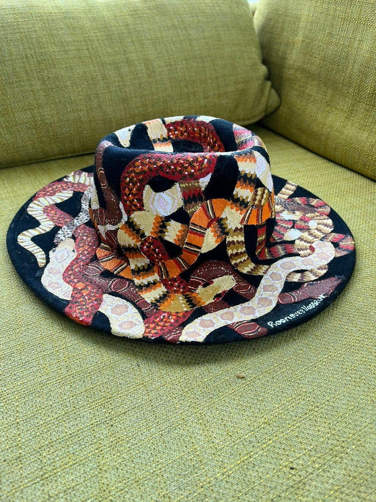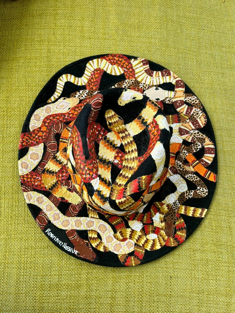 Sombrero Artesanal de Autor Negro pintada por oleos Serpientes, elaborado con fieltro de gramaje de 200, materia prima originaria de Ecuador, mas que un sombrero, una pieza de arte para tu cabeza.